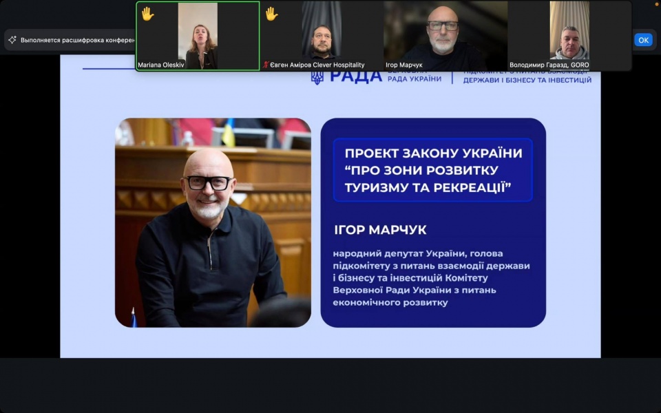 За ініціативи Голови підкомітету з питань взаємодії держави і бізнесу та інвестицій Комітету з питань економічного розвитку Ігоря Марчука відбулося обговорення нової законодавчої ініціативи про зони розвитку туризму та рекреації, спрямованої на залучення інвестицій в економіку України.
